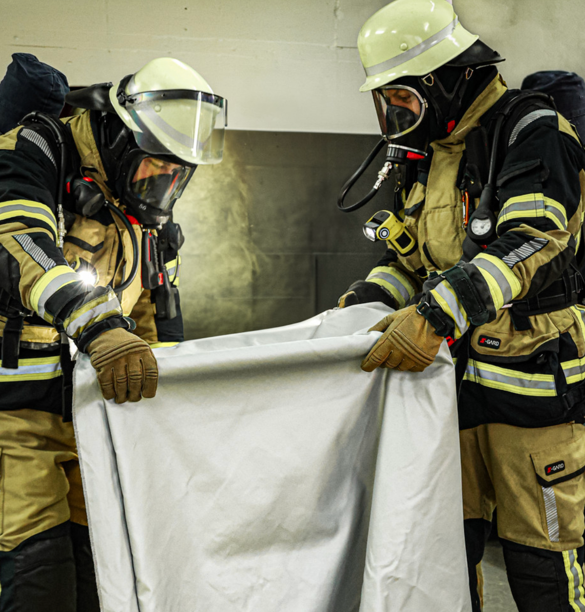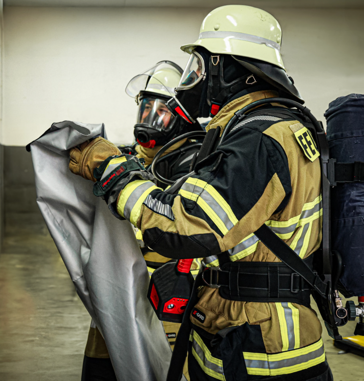 Nach dem Einsatz lässt sich der Rauchschutzvorhang platzsparend in der mitgelieferten Transporttasche verstauen. Die Tasche ist mit praktischen Befestigungsschlaufen ausgestattet, sodass der Vorhang sicher am Schlauchtragekorb transportiert werden kann.